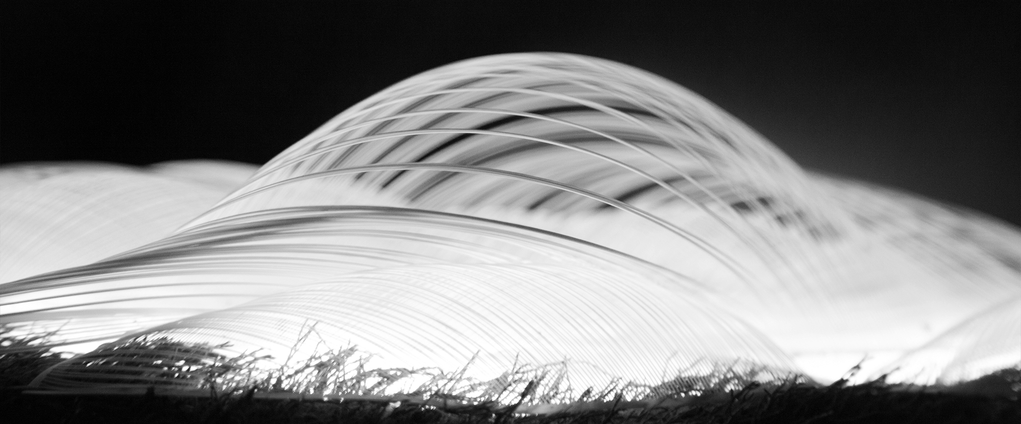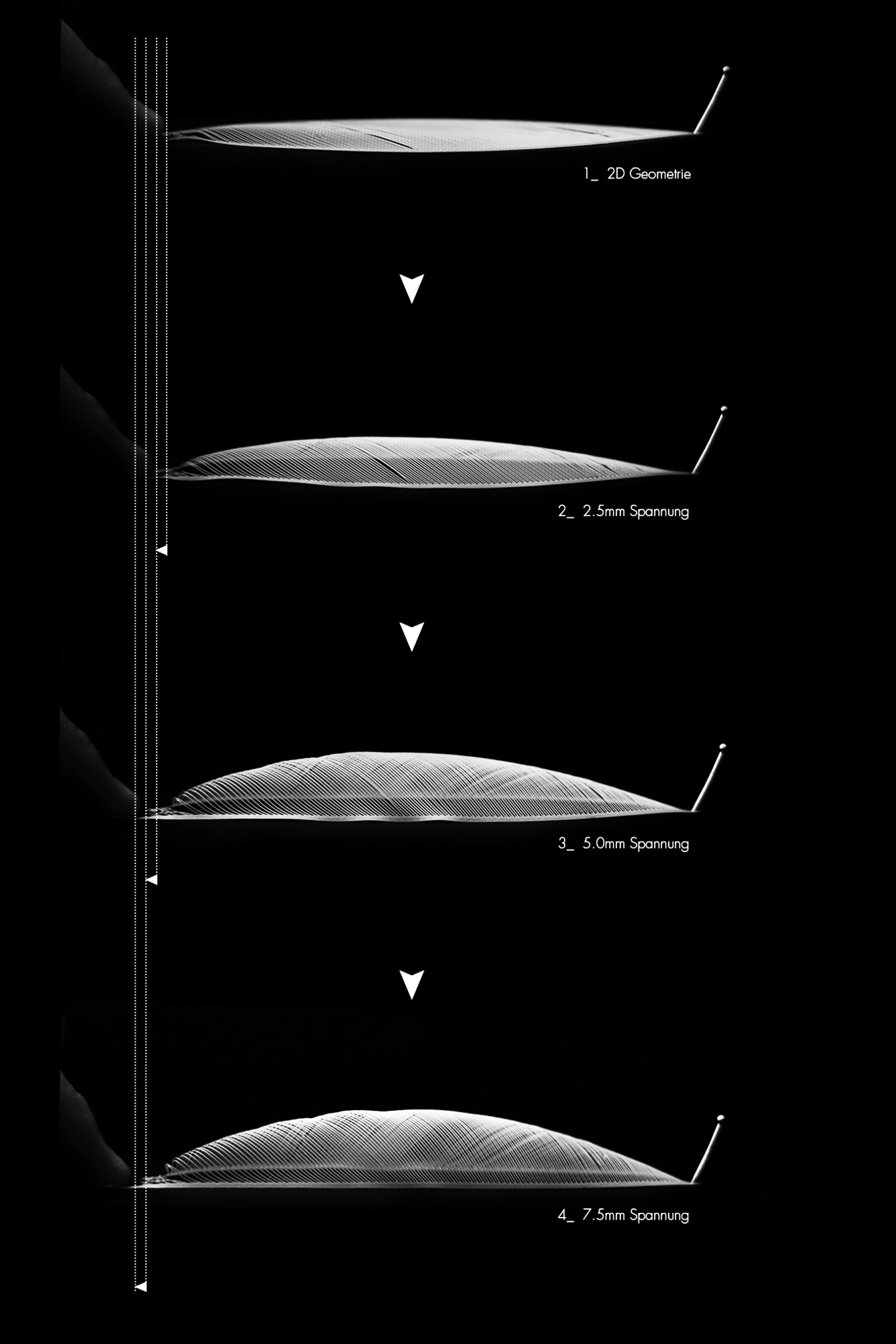 This image illustrates how a complex three-dimensional structure is formed from an apparently simple initial geometry. Parameters such as the strength of the prestressing, the geometry of the subsoil or the combination of several modules influence the final morphology of the "swarm", which gives the installation its own character depending on its location.